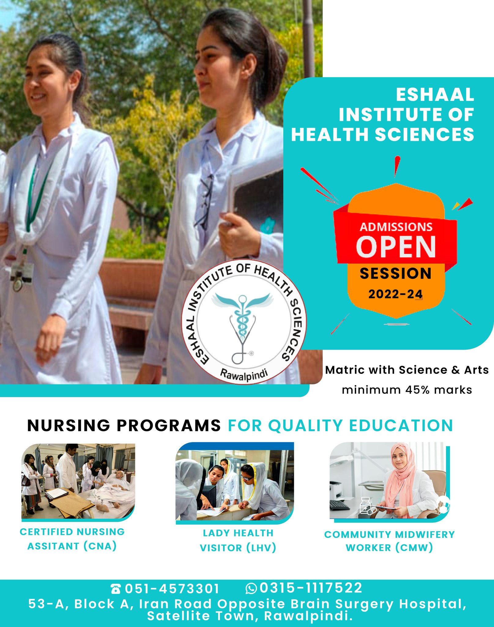 Eshaal Institute of Health Sciences Rawalpindi is dedicated to shaping compassionate and skilled healthcare professionals through our Nursing Programs. Whether you aspire to become a Lady Health Visitor (LHV), a Certified Nursing Assistant (CNA), or a Community Midwife (CMW), our programs are designed to provide a comprehensive blend of theoretical knowledge and practical training. With a focus on nurturing empathy, critical thinking, and clinical expertise, our experienced faculty is committed to guiding students towards a fulfilling career in nursing. Join Eshaal Institute of Health Sciences Rawalpindi, where excellence meets compassion in nursing education. Seize the opportunity to make a positive impact on healthcare – enroll now and embark on a journey towards a rewarding nursing career. Your calling awaits, and we are here to help you answer it!